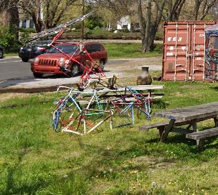 When I talked to Green Fleet’s owner as he and staff cleaned up the debris from the storm, he told me passers-by thought the smashed up version of the sculpture was all their good bikes mangled up and crushed together by the storm! The original was done by an artist who the owner could only describe as “an artist from Wedgewood-Houston” and had been added on to by staff overtime. The bus in the background, painted by Andee Rudloff, survived the storm unscathed.