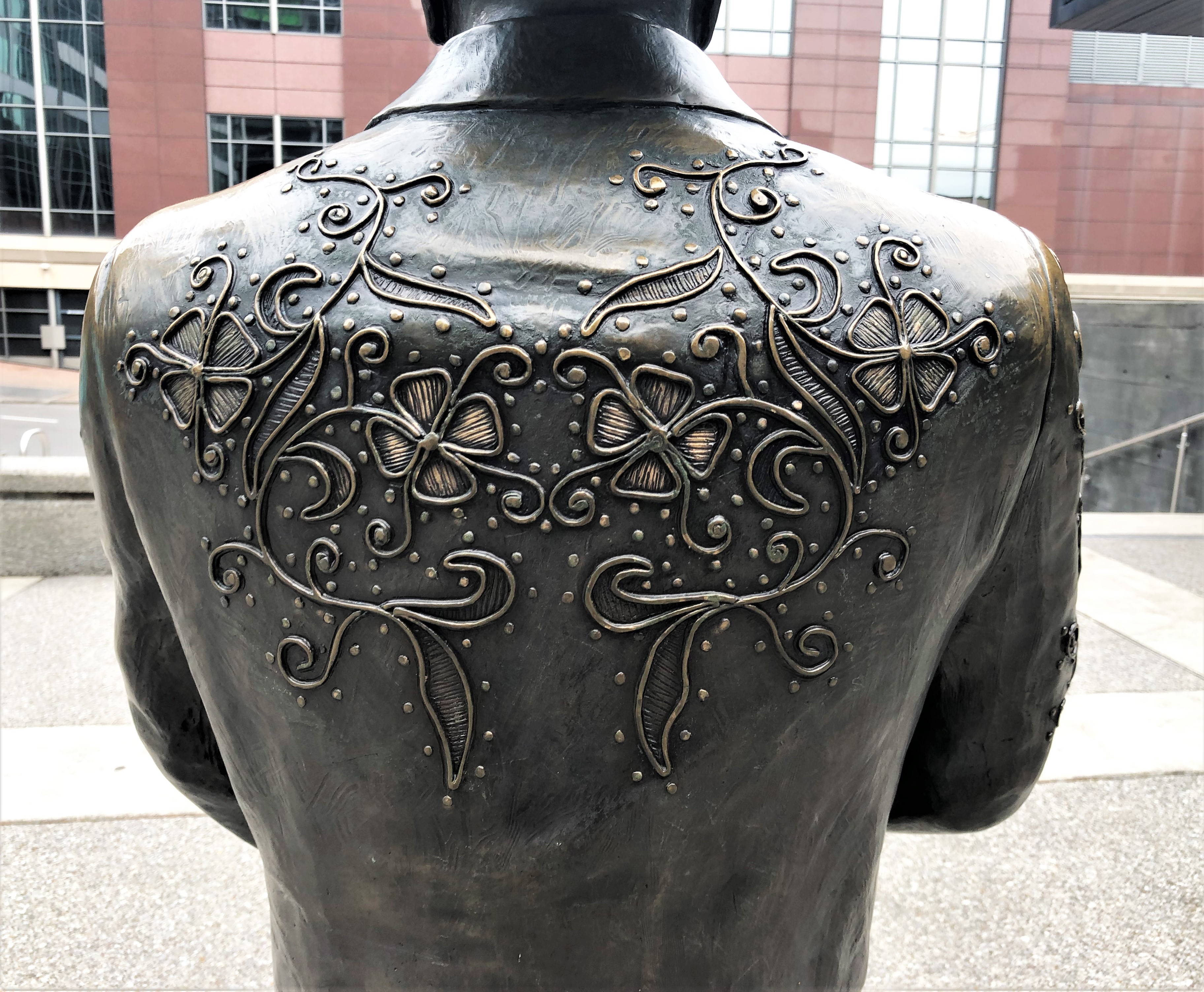 Today is the fourth anniversary of this blog, and I present a work of art no Nashvillian has ever seen. Ok, not a very good joke, but the “Musica” sculpture by Alan LeQuire has been a notable absence from a blog with the motto “no art left behind.” It is in fact one of the most commented-on works of art in Nashville, ever since it went up in 2003. The nakedness of the figures has been a main point of discussion, and at various times pranksters have put clothes on them. Recently, they were briefly masked. Perhaps less known is that the traffic circle they sit in is the Buddy Killen Circle. Killen was an important Music Row producer and publisher before his death in 2006. (Pictures of “Musica” in the round can be found at the bottom of the post.)